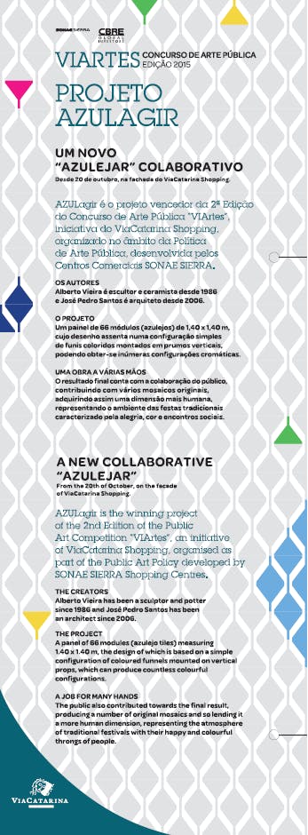 O AZULagir, de Alberto Vieira (ceramista e escultor) e José Pedro Santos (arquiteto e designer), foi o projeto vencedor do VIArtes 2015. Esta obra de arte traduz-se numa instalação composta por uma representação de 66 azulejos cujo desenho assenta numa configuração simples de funis coloridos montados, em prumos verticais, que permitem obter inúmeras configurações geométricas através do seu jogo de cores.